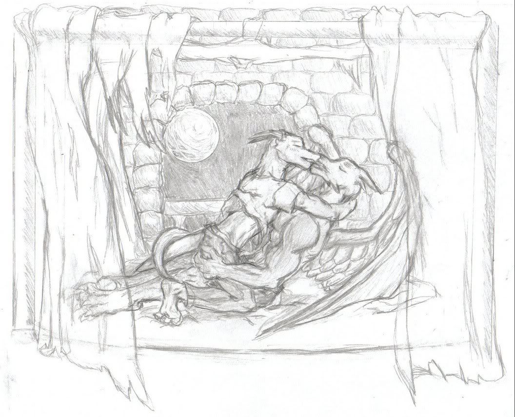 I had passed quite a few restaurants, all serving food that smelled so delicious, however I wasn't able to get any of it. I had hardly any money at the time and I wanted to make sure I'd have my sleeping accommodations more secure. But that's when I first saw him. Probably one of the most gorgeous creatures to ever set foot on this dirtied planet. His physical appearance seemed to be that of a dragons with one exception; he had fur. He had dark gray fur... and bright green eyes. It was apparent that under his fur he was very muscular. He had on beige pants and some dark gray cloth and a dark blue shirt. His wings that were contracted behind him were made of feathers and had a deep red coloration that blended in with the rest of him... I had never seen anything like him before.